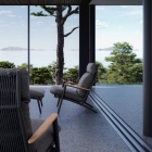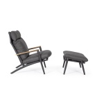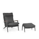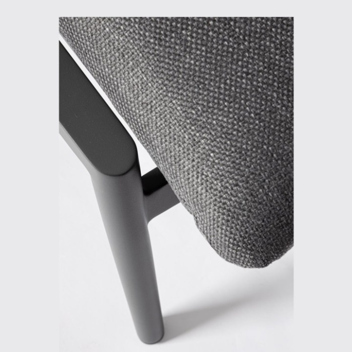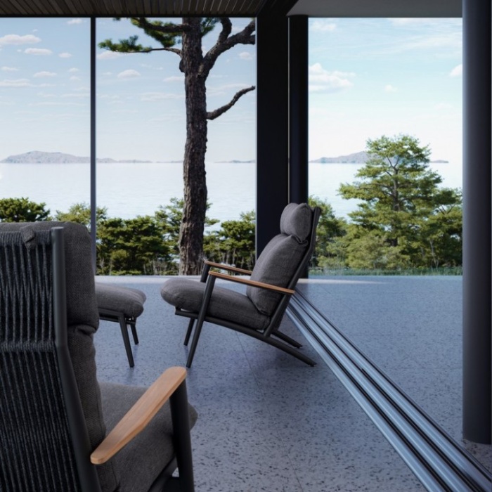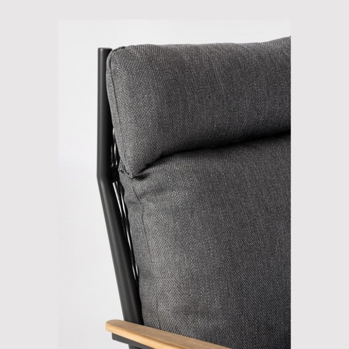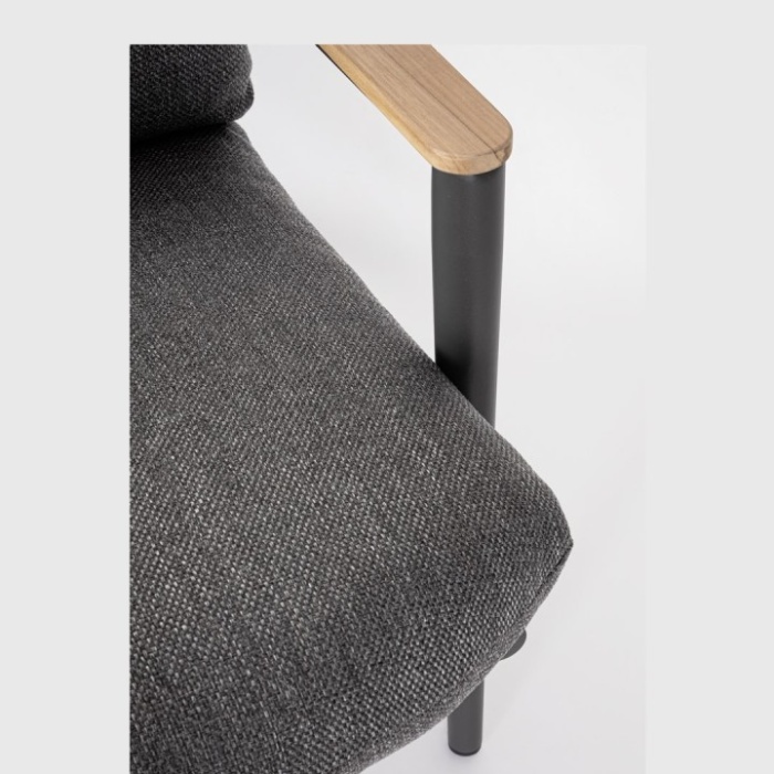 Un dettaglio distintivo è rappresentato dai braccioli con inserti in teak, un materiale naturale e resistente che dona un tocco caldo e raffinato al design complessivo.