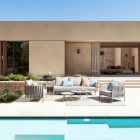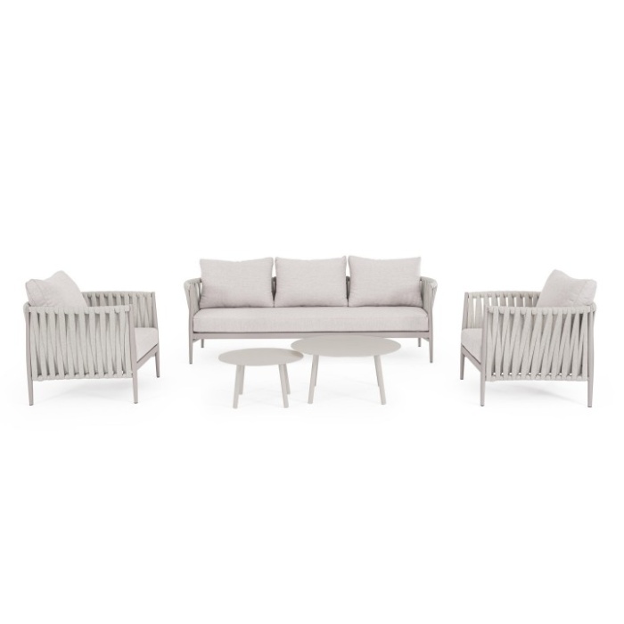 I cuscini di seduta e schienale sono sfoderabili e rivestiti in tessuto idrorepellente Olefin (100% polipropilene), facile da pulire e pensato per resistere a sole, pioggia e umidità.