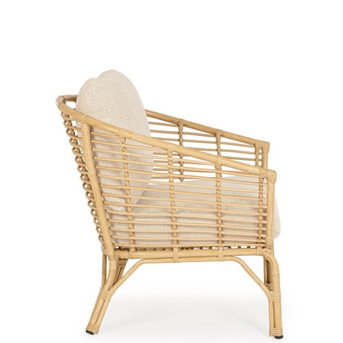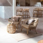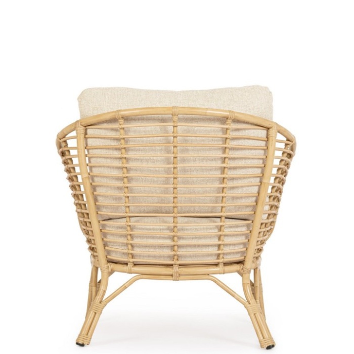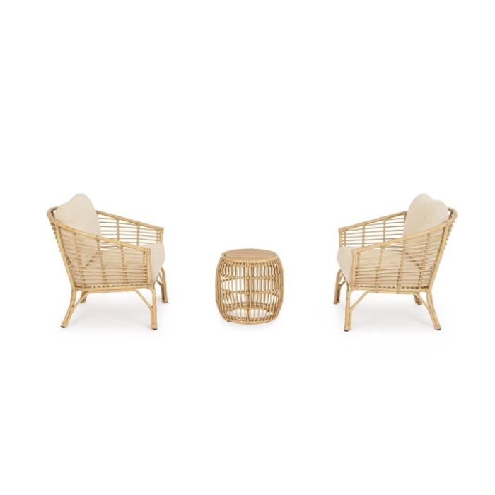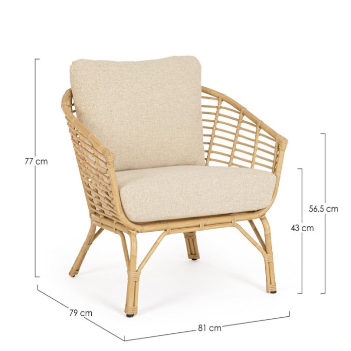 La struttura in alluminio verniciato effetto rattan e l’intreccio in fibra sintetica tonda da 10 mm donano un look naturale e resistente.