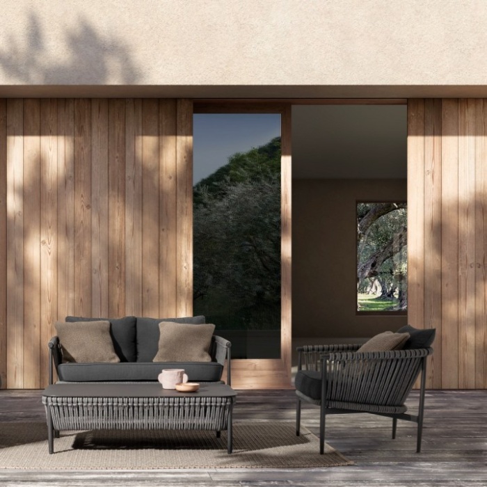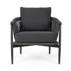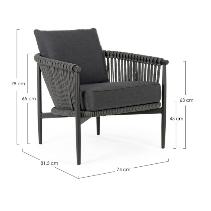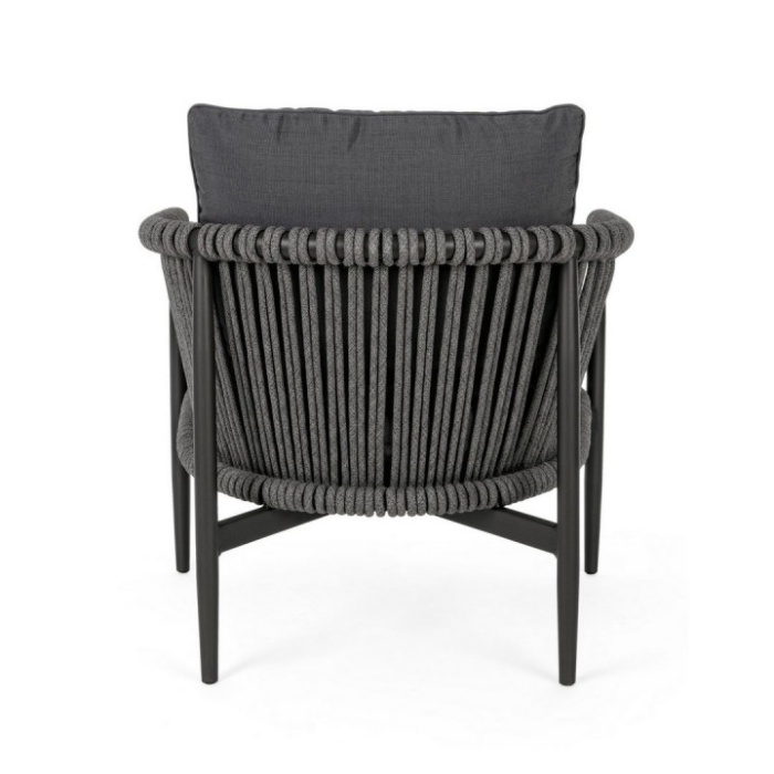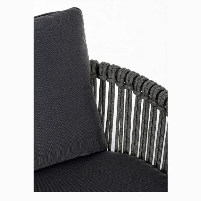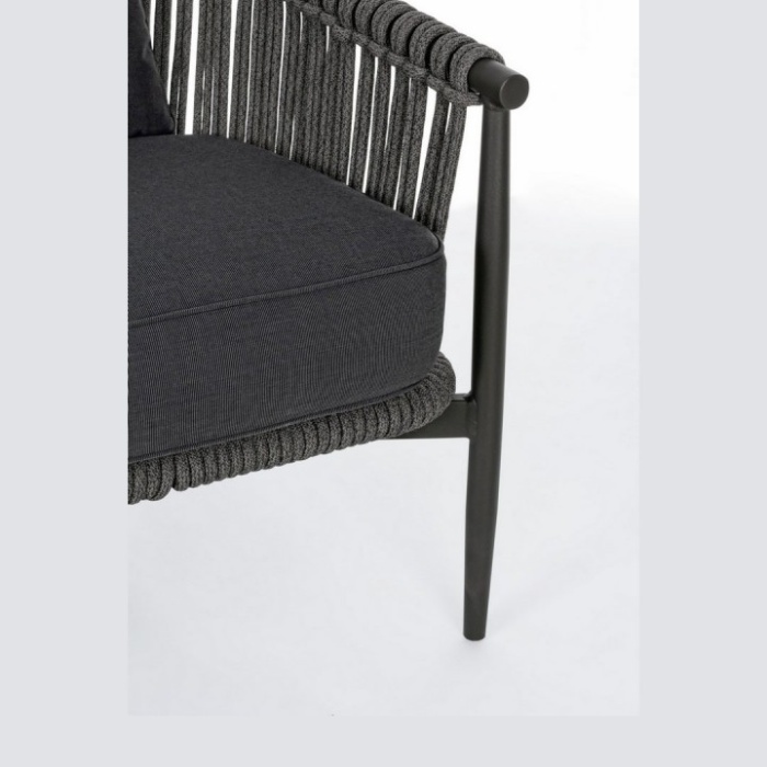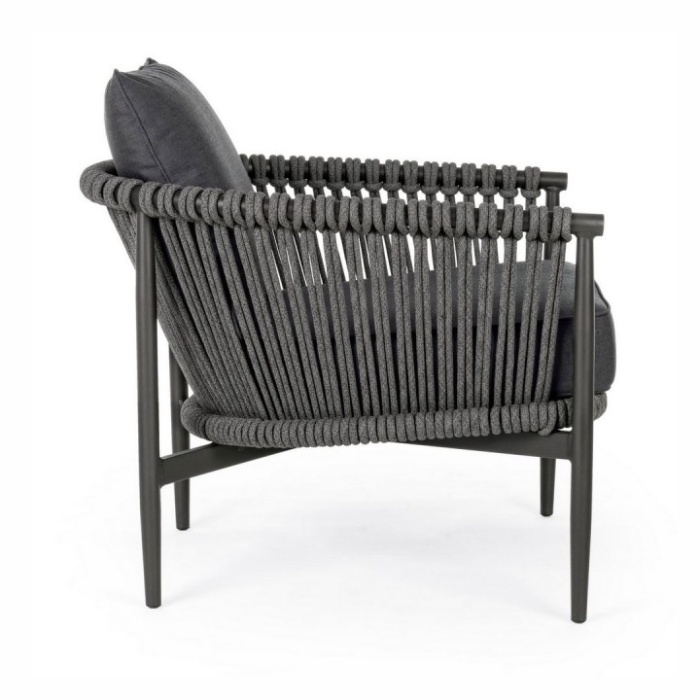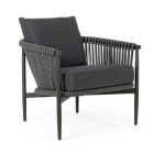 L’intreccio in corda per esterni, realizzato in polipropilene idrorepellente e resistente ai raggi UV, dona alla poltrona un aspetto raffinato, contribuendo al comfort della seduta e al fascino naturale del prodotto.