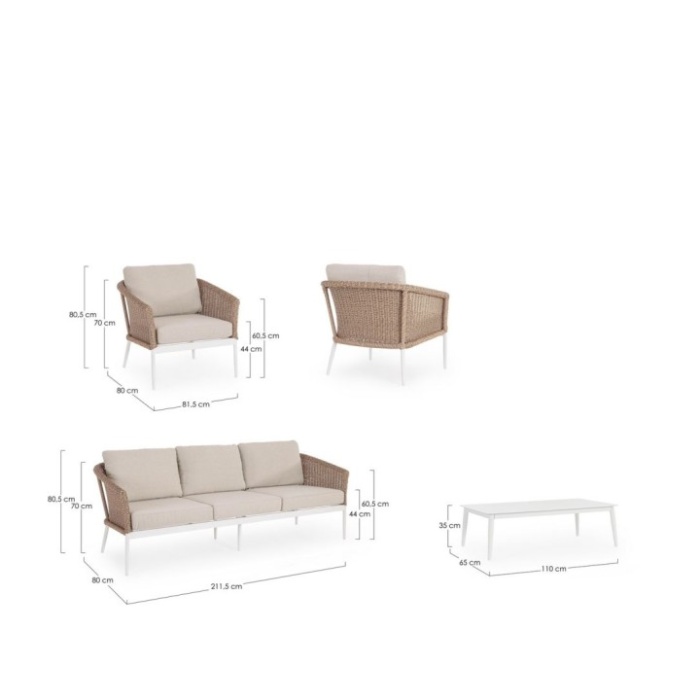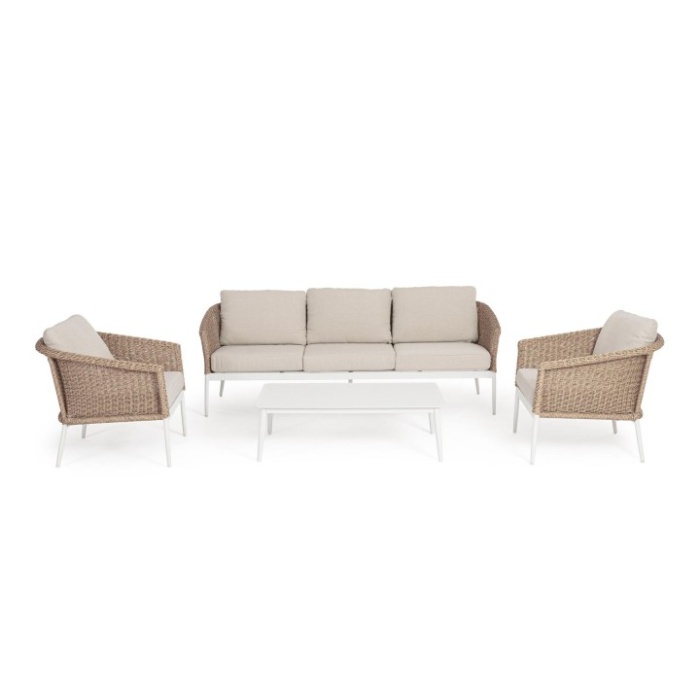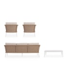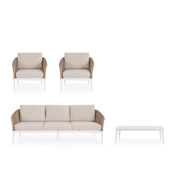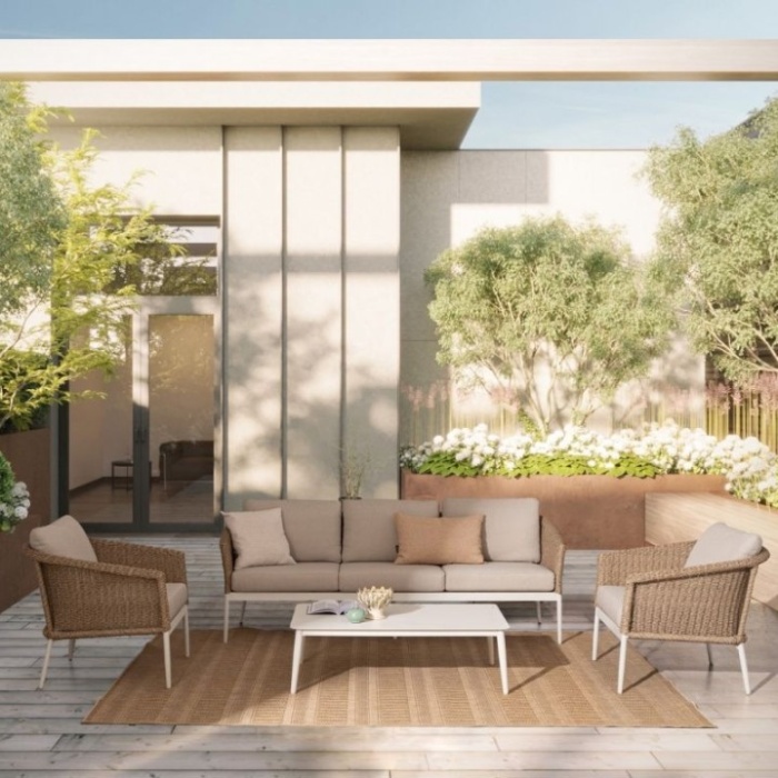 Composto da un divano tre posti, due poltrone e un tavolino, questo set è pensato per trasformare giardini, terrazzi o verande in vere oasi di relax.
