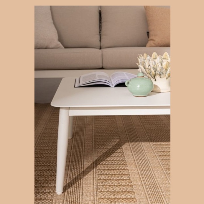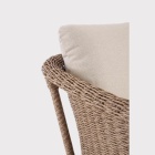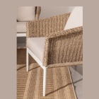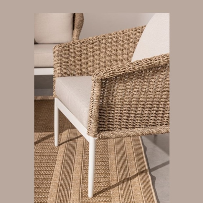 La struttura in alluminio verniciato a polvere (poliestere) offre una protezione efficace contro ruggine e deterioramento, mentre la seduta in fibra sintetica (tonda 3.5 mm) aggiunge un tocco di artigianalità e stile.