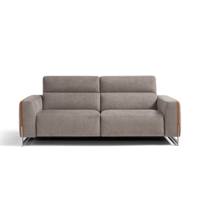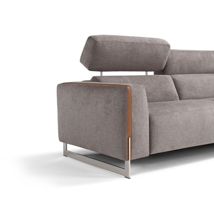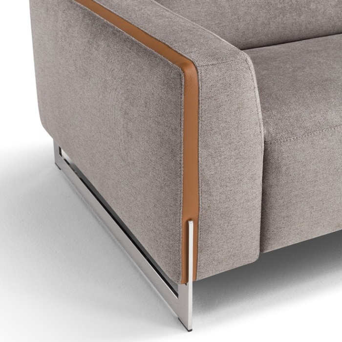 I braccioli decorativi, impreziositi da una fascia in pelle a contrasto, si integrano armoniosamente con la base in metallo a slitta, conferendo al divano un aspetto moderno e distintivo.