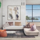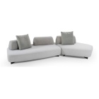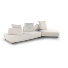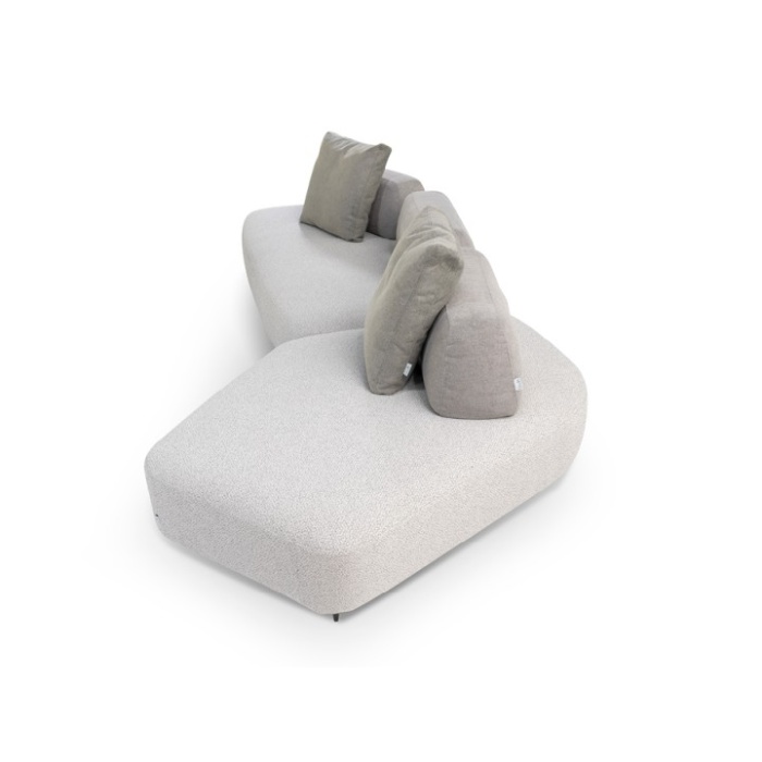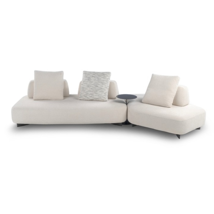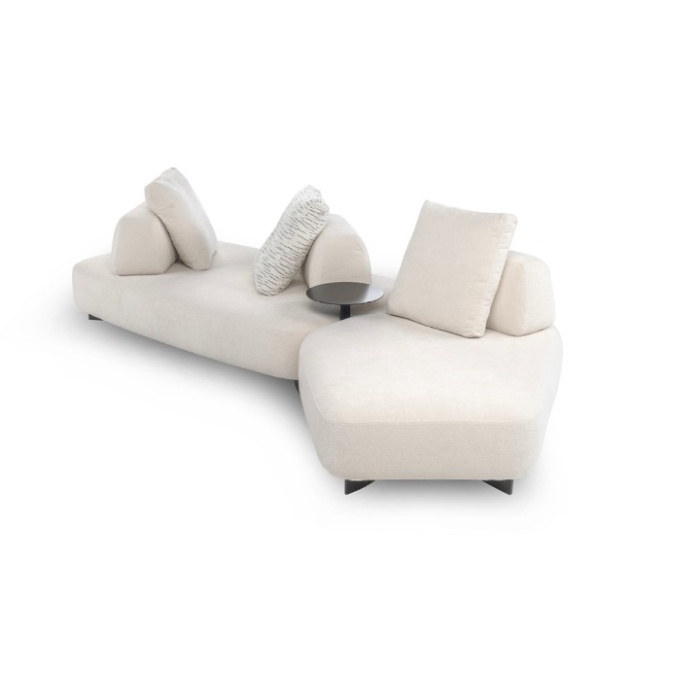 Le basi, di diverse dimensioni, possono vivere singolarmente, essere affiancate tra loro o abbinate a pezzi speciali (base dormeuse e base chaise longue) o ancora intervallate da “basi-angolo” che permettono di creare con pochi elementi svariate configurazioni. Infine, il “Pouf e Chaise Longue nodo” rappresenta l’elemento terminale o intermedio tra due basi e può essere corredato di piano tavolino in legno.
