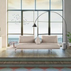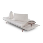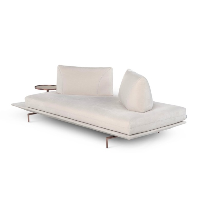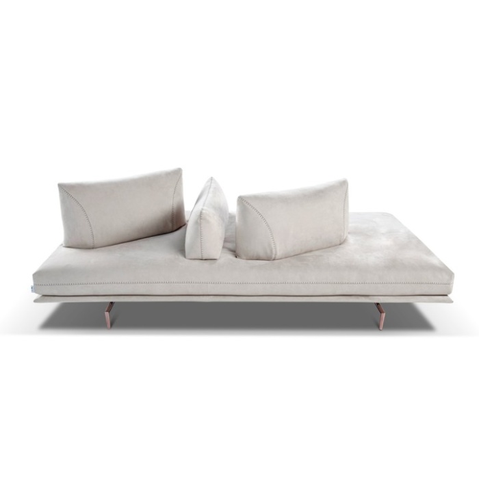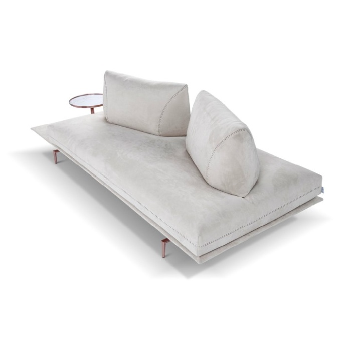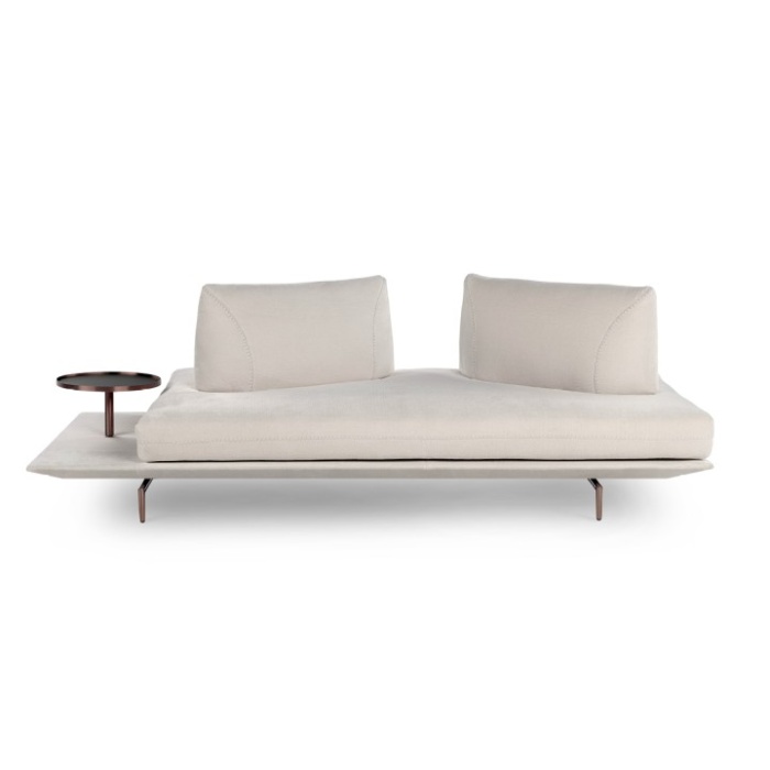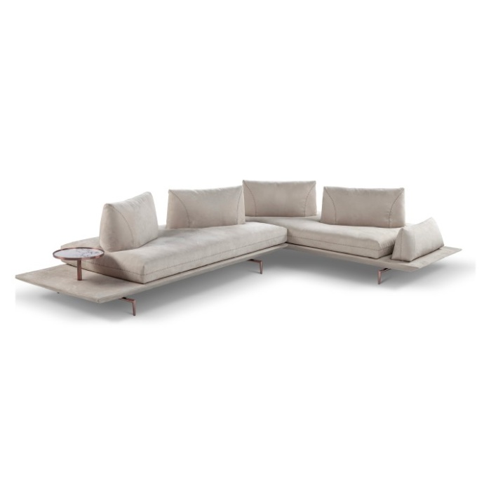 - Componenti: le versioni “terminali” sono dotate di prolungamento della base del divano, utile come piano di appoggio. Le versioni “terminale tavolino” sono inoltre corredate di elemento tavolino in metallo con piano effetto marmo e struttura in finitura rame. In alternativa, è possibile scegliere tra le finiture: satinato, titanio oppure graubraun. Su richiesta e con supplemento di prezzo è possibile richiedere il piano tavolino in vetro colore bronzo.