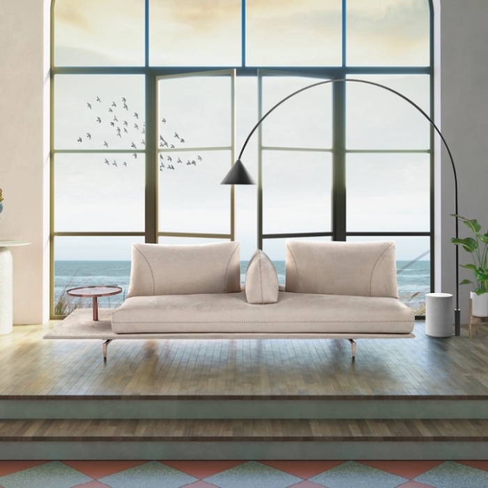La sua natura aperta e destrutturata lo rende il protagonista ideale al centro dell’ambiente, con una cucitura decorativa sulle spalliere e sul perimetro della seduta che contribuisce a impreziosirne il disegno.