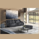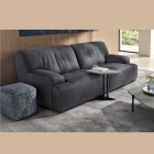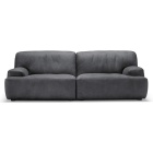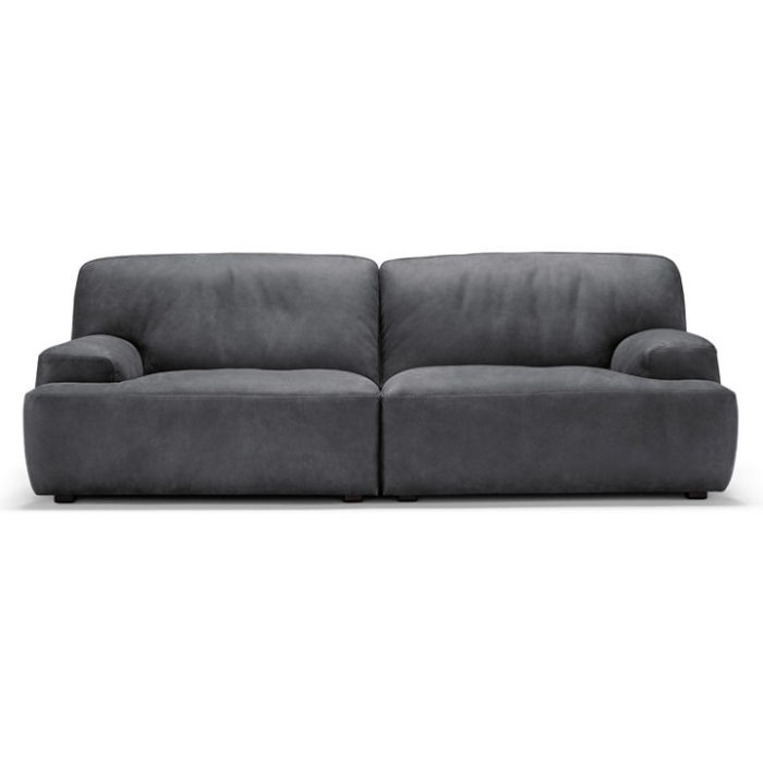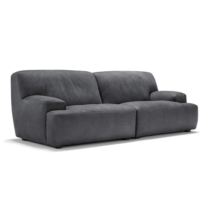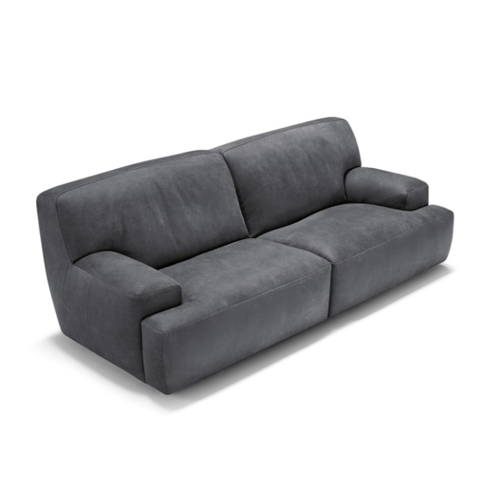 Il rivestimento, disponibile in pregiata pelle nabuk o in tessuto, è esaltato da cuciture a contrasto che donano al divano un tocco artigianale e ricercato.