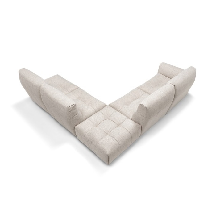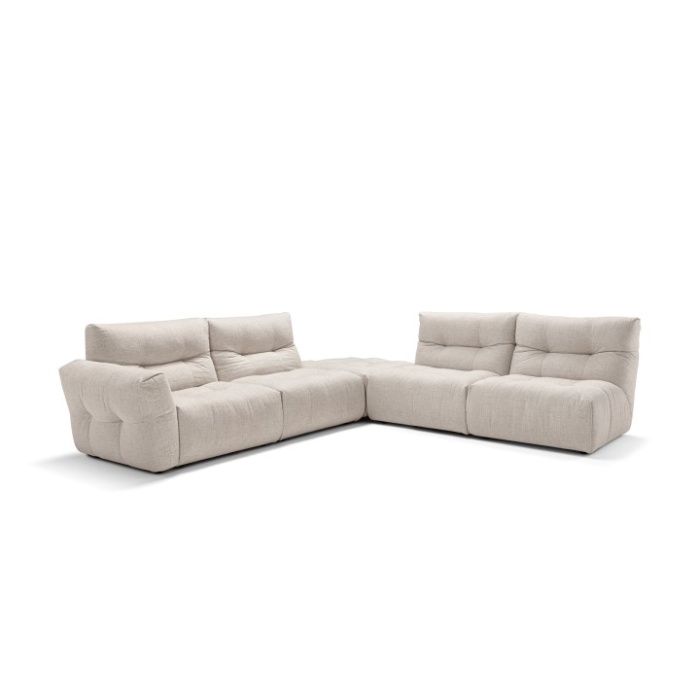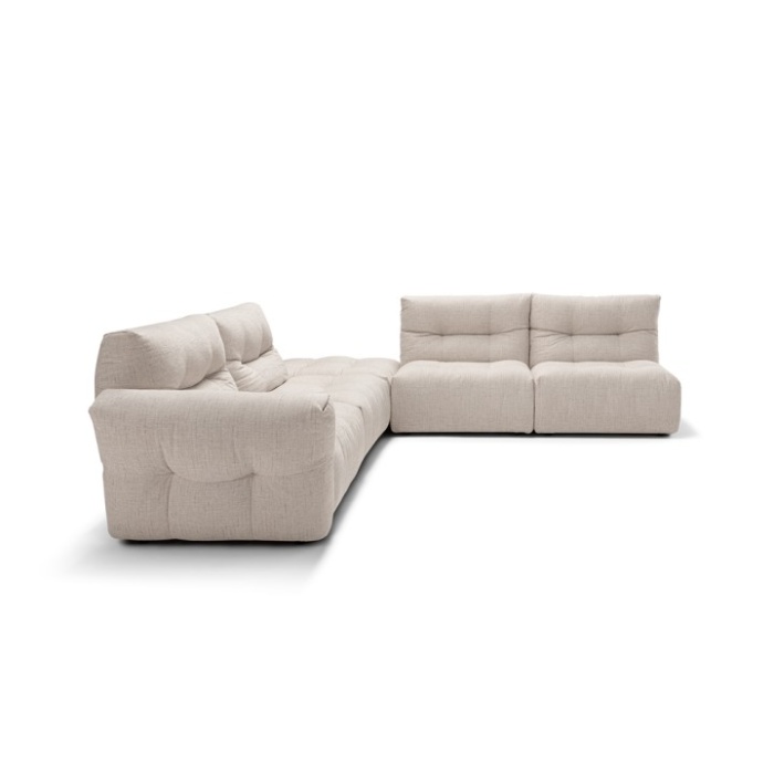 Le imbottiture in mix di piuma e poliuretano espanso garantiscono un comfort elevato, mentre la possibilità di configurarlo in versione lineare o angolare, grazie all’aggiunta di un pouf quadrato, lo rende estremamente versatile.