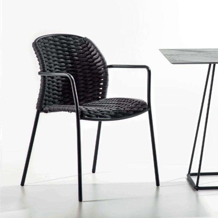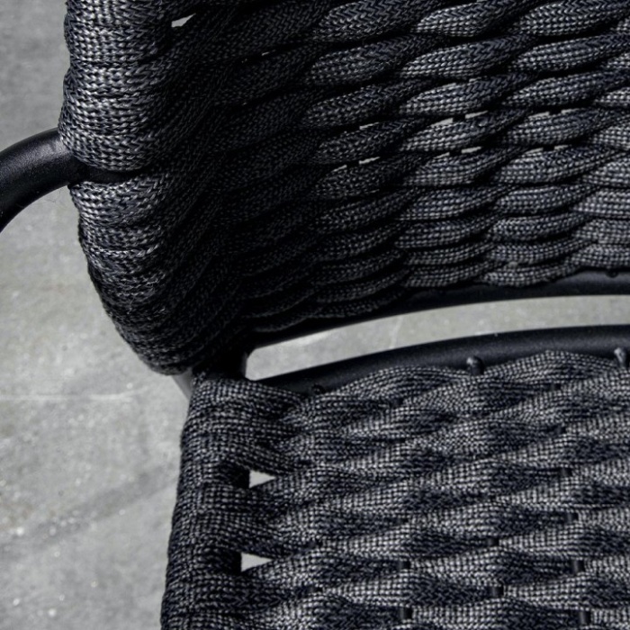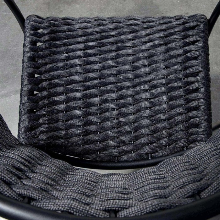 Realizzata con struttura in metallo zincato finitura antracite e seduta in corda di poliestere con interno in gomma, offre resistenza e comfort.