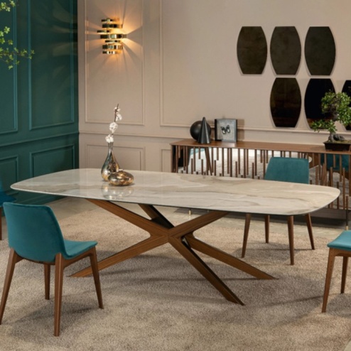 Blade si distingue per la sua base centrale unica, un elemento di design che unisce stabilità e leggerezza in un equilibrio perfetto. Realizzata in acciaio verniciato o impreziosita da una cover in legno, la base si apre elegantemente verso il piano d’appoggio, creando un effetto visivo dinamico e armonioso. Le linee fluide e raffinate lo rendono un vero protagonista della scena, perfetto per ambienti contemporanei che esigono eleganza e personalità. Il piano, disponibile in diverse finiture pregiate, enfatizza il carattere esclusivo del tavolo, offrendo versatilità e adattabilità a vari contesti d’arredo. Grazie alla combinazione di materiali di alta qualità e un design ricercato, questo tavolo diventa non solo un complemento funzionale, ma anche un elemento decorativo capace di valorizzare ogni spazio. Ideale per chi desidera un tavolo che coniughi estetica e praticità, trasformando la zona pranzo o il living in un ambiente di grande fascino e stile.
