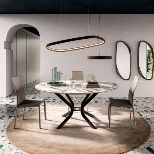 Il tavolo Cirkle di Ozzio si compone di un piano in ceramica dalla forma circolare, un basamento in metallo e dei piedini regolabili, il tavolo perfetto per aggiungere valore alla tua sala pranzo.