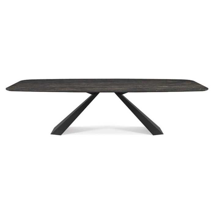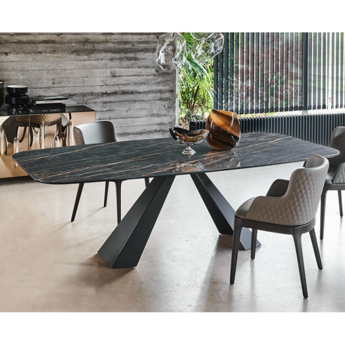 Tavolo Eliot Keramik di Cattelan Italia realizzato con base in acciaio verniciato goffrato titanio (GFM11), bronzo (GFM18), graphite (GFM69) o nero (GFM73). Piano in ceramica Marmi nei colori Alabastro (KM02), Golden Calacatta opaco (KM05), Golden Calacatta lucido (KM06), Portoro opaco (KM07), Portoro lucido (KM08), Sahara Noir lucido (KM09), Makalu (KM11), Breccia (KM12), Corcovado (KM14), Kaindy (KM16), Borghini Calacatta opaco (KM18), Borghini Calacatta lucido (KM19), Colosseo (KM21), Andromeda (KM22), Invisible opaco (KM24) o Luxor (KS23). Piano in appoggio.