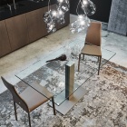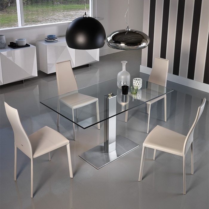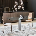 Tavolo Elvis di Cattelan Italia realizzato con base in acciaio inox satinato e colonna in acciaio inox lucido o verniciato goffrato titanio (GFM11) o graphite (GFM69). Piano in cristallo trasparente 15mm.