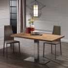 Tavolo Elvis Wood di Cattelan Italia con base in acciaio inox satinato e colonna in acciaio inox lucido o verniciato goffrato titanio (GFM11) o graphite (GFM69). Versione S piano in noce Canaletto (NC), rovere bruciato (RB) o rovere naturale (RN) con bordi irregolari in massello.