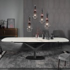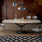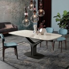 La fermezza dell’acciaio viene in questo tavolo resa morbida e agile, grazie alle curve che formano la base. I piani in vetro, ceramica, o porcellanato, disponibili in tutte le finiture Tonin Casa, si poggiano sicuri su binari in alluminio studiati per combinare eleganza e funzionalità.