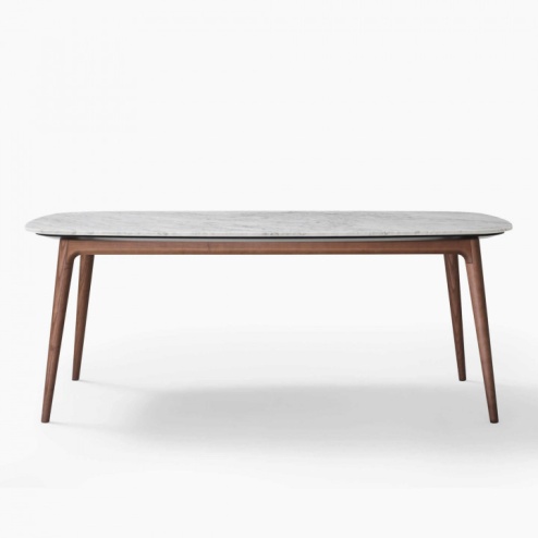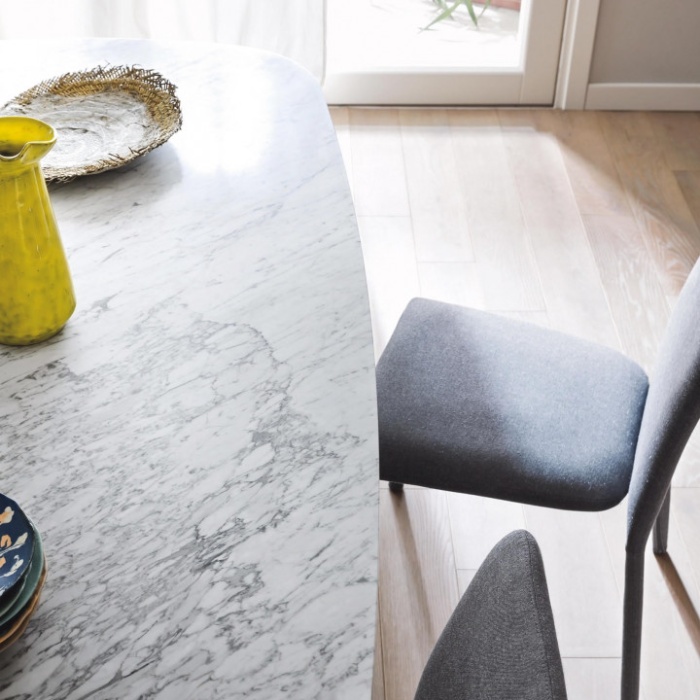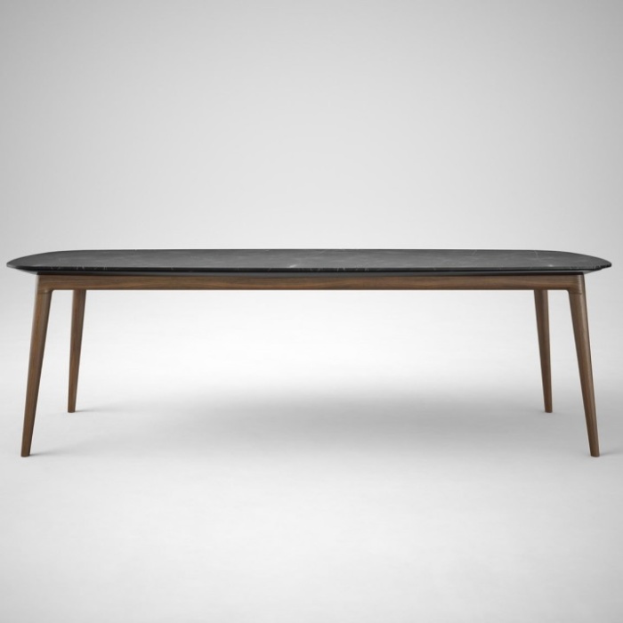 Tavolo fisso di design per sala pranzo o cucina mod. Hanami marchio Novamobili. Gambe in legno massello Noce Canaletto o Rovere Chiaro. Piano in marmo di Carrara bianco, marmo Oriente grigio, marmo Guatemala verde oppure Pietra Lavica. Le gambe inclinate e rastremate dal grande impatto estetico combinate all'elegante finitura del piano ultrasottile in vero marmo rendono questo tavolo estremamente elegante e raffinato.