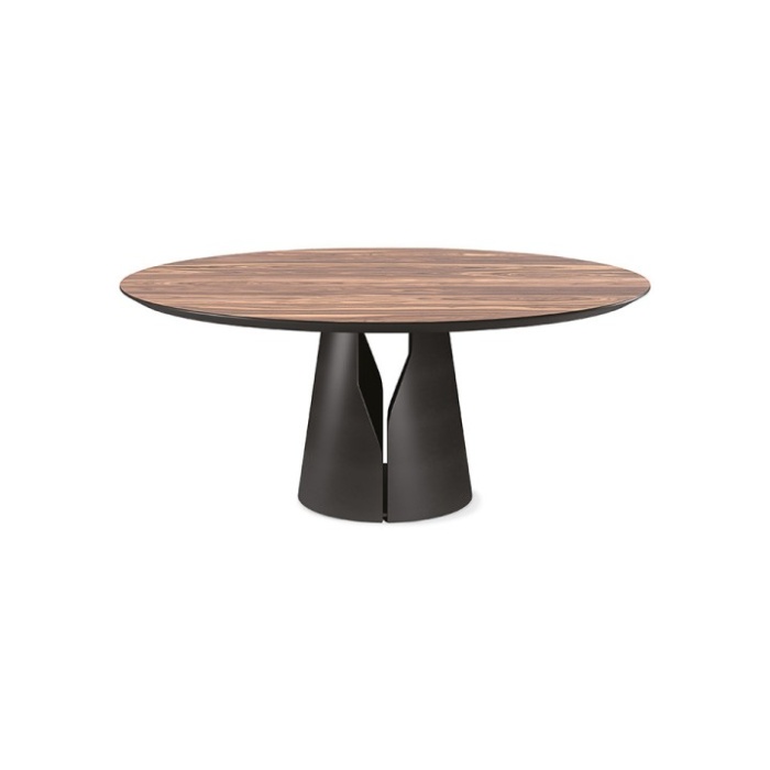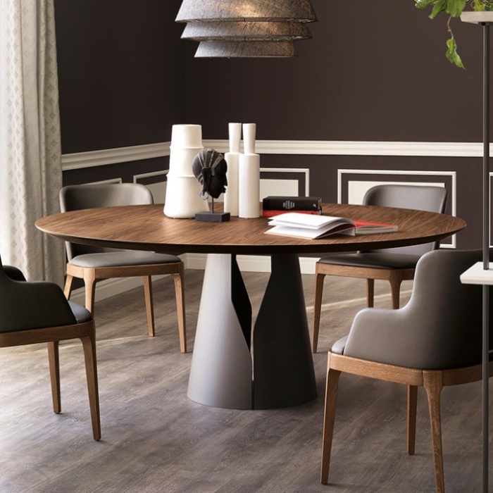 Tavolo Giano di Cattelan Italia con base in acciaio verniciato goffrato titanio (GFM11), bronzo (GFM18), graphite (GFM69), pearl (GFM70) o nero (GFM73). Piano in legno noce Canaletto (NC) o rovere bruciato (RB).