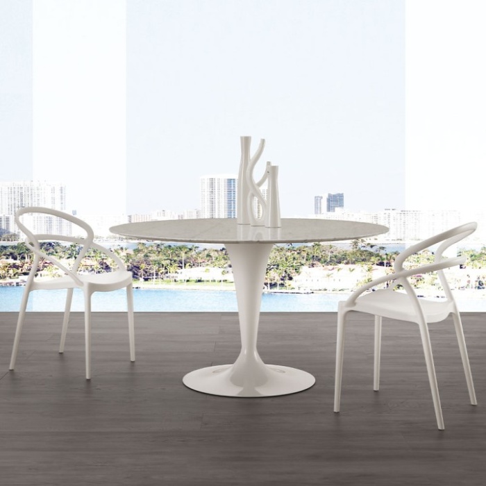 Il piano in marmo di Carrara da 20 mm conferisce al tavolo un aspetto lussuoso e una superficie resistente, mentre la base in acciaio verniciato bianco assicura stabilità e un design minimalista.