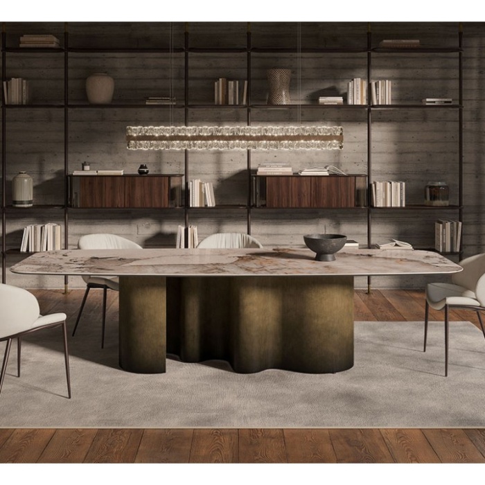 La sua base sinuosa è disegnata con abilità progettuale, per cambiare aspetto a seconda della posizione dalla quale la si osserva. I cilindri pieni e vuoti si scambiano di posto mentre luci e ombre si alternano, se si ammira questo tavolo di design da diverse angolazioni. Papel risulta quindi snello e imponente allo stesso tempo, soprattutto se si sceglie di arricchire la base con una finitura della linea Brushed: spazzolata a mano libera da abili artigiani. La base in metallo curvato viene realizzata in un pezzo unico, aumentando il pregio di questo tavolo da pranzo moderno.