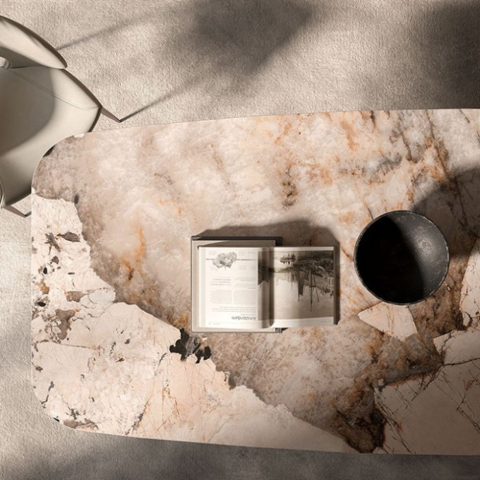 Tavolo con base in acciaio verniciato goffrato titanio (GFM11), bronzo (GFM18), Oxybrass o Oxygrey. Piano in ceramica Marmi nei colori Alabastro (KM02), Golden Calacatta opaco (KM05), Golden Calacatta lucido (KM06), Portoro opaco (KM07), Portoro lucido (KM08), Sahara Noir lucido (KM09), Makalu (KM11), Breccia (KM12), Corcovado (KM14), Kaindy (KM16), Borghini Calacatta opaco (KM18), Borghini Calacatta lucido (KM19), Colosseo (KM21), Andromeda (KM22), Invisible opaco (KM24) o Luxor (KS23). Piano in appoggio.
