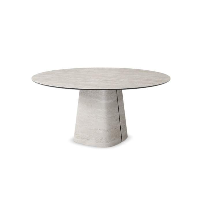 tavoli con base centrale Rado accostano due gusci perfettamente simmetrici. Un particolare risalta sul lato corto del basamento: la gola verticale rientrante rivestita in ceramica, che spezza la superficie altrimenti uniforme. Si ottiene così un tavolo in ceramica moderno che esprime una nuova contemporaneità estetica, unendo finiture classiche ispirate ai marmi naturali, a tecniche produttive senza precedenti.