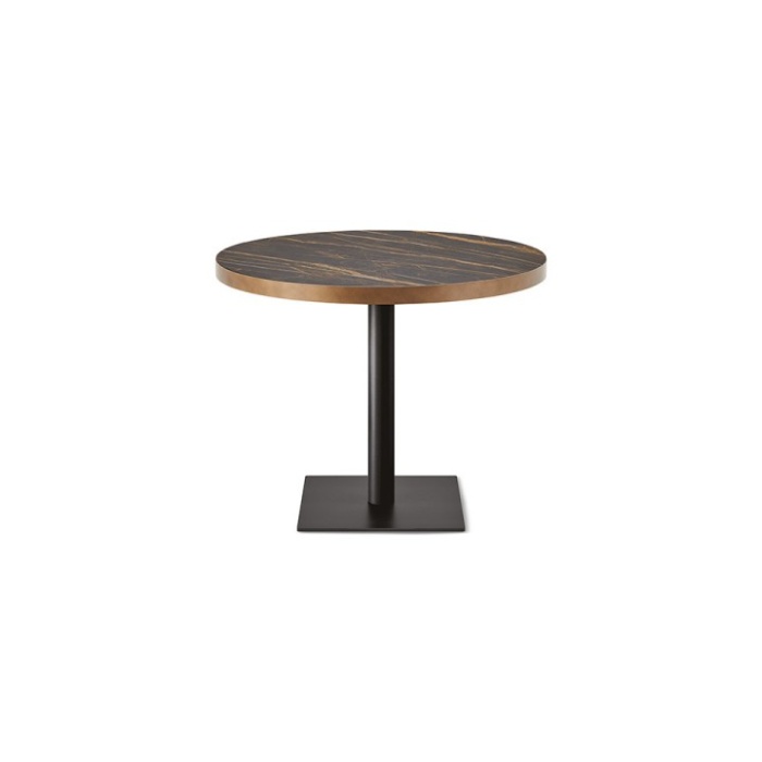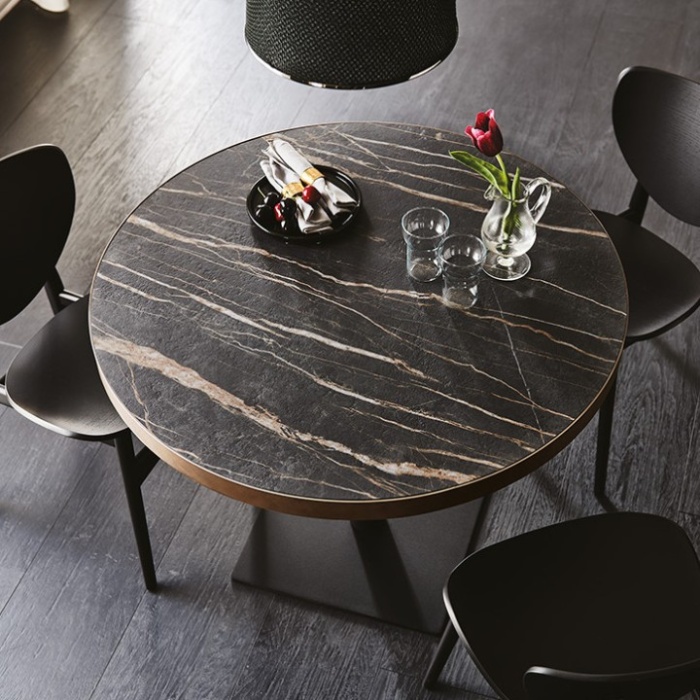 Tavolo Ribot Keramik Bistrot di Cattelan Italia realizzato con base in acciaio verniciato goffrato titanio (GFM11), graphite (GFM69) o nero (GFM73), e cornice del top in acciaio verniciato goffrato titanio (GFM11), graphite (GFM69) o nero (GFM73) o Brushed Bronze. Piano in ceramica Marmi nei colori Alabastro (KM02), Portoro opaco (KM07), Portoro lucido (KM08) o Makalu (KM11). Variazioni cromatiche e di spazzolatura della finitura Brushed sono caratteristiche della lavorazione artigianale e non sono da considerarsi difetti.