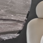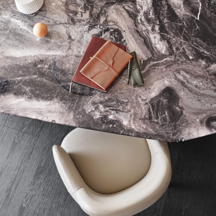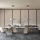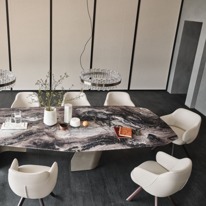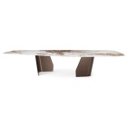 Ogni dettaglio, dalla forma del piano, alle basi in metallo asimmetriche, alla decorazione del piano, dà l'impressione di trovarsi di fronte ad un oggetto naturale, a una pietra preziosa o un monolite modellato dall'uomo per assegnarvi una funzione. In particolare, il piano affascina per la raffinata e originale finitura, una tecnica di stampa su vetro decorativa che ricorda le venature del marmo, accentuata su tutto il perimetro dall'elegante bisello del cristallo. Ricco di sfumature e riflessioni, questo tavolo di design da 4 metri è l'ideale in una sala da pranzo spaziosa, in un lussuoso ufficio o in un ambiente di rappresentanza.