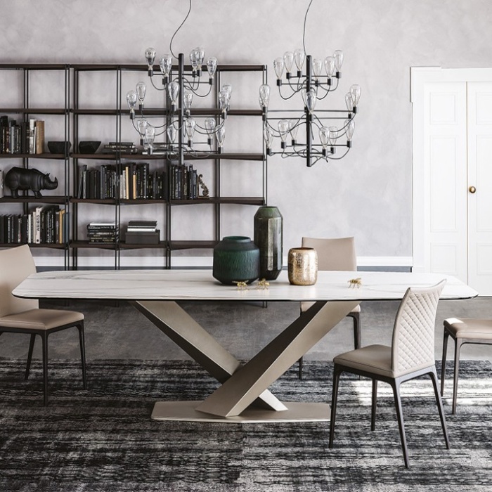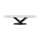 Tavolo Stratos Keramik di Cattelan Italia realizzato con base in acciaio verniciato goffrato titanio (GFM11), bronzo (GFM18), graphite (GFM69), nero (GFM73). Piano in ceramica Marmi nei colori Alabastro (KM02), Golden Calacatta opaco (KM05), Golden Calacatta lucido (KM06), Portoro opaco (KM07), Portoro lucido (KM08), Sahara Noir lucido (KM09), Makalu (KM11), Breccia (KM12), Corcovado (KM14), Kaindy (KM16), Borghini Calacatta opaco (KM18), Borghini Calacatta lucido (KM19), Colosseo (KM21), Andromeda (KM22), Invisible opaco (KM24) o Luxor (KS23). Piano in appoggio.