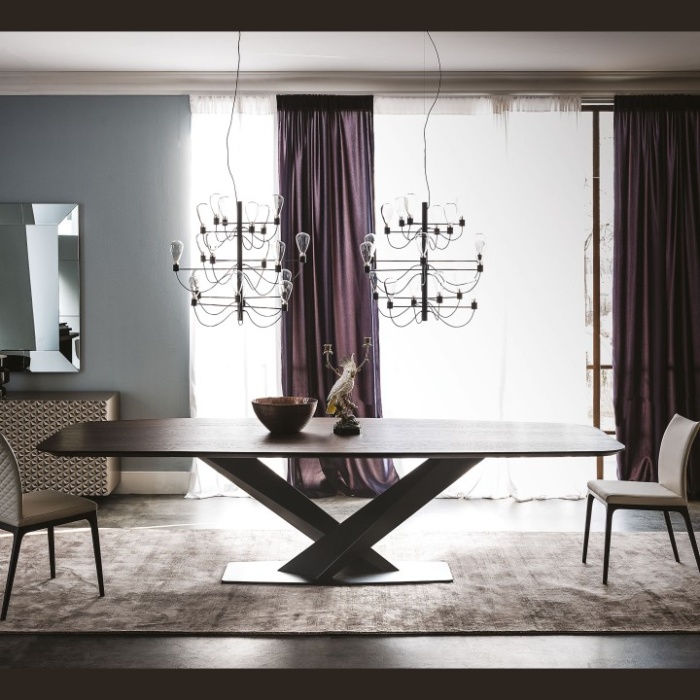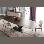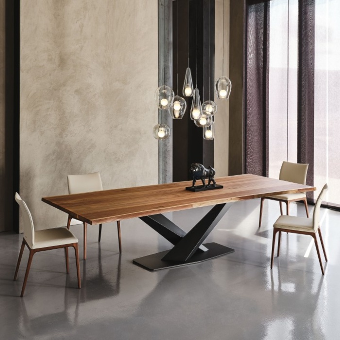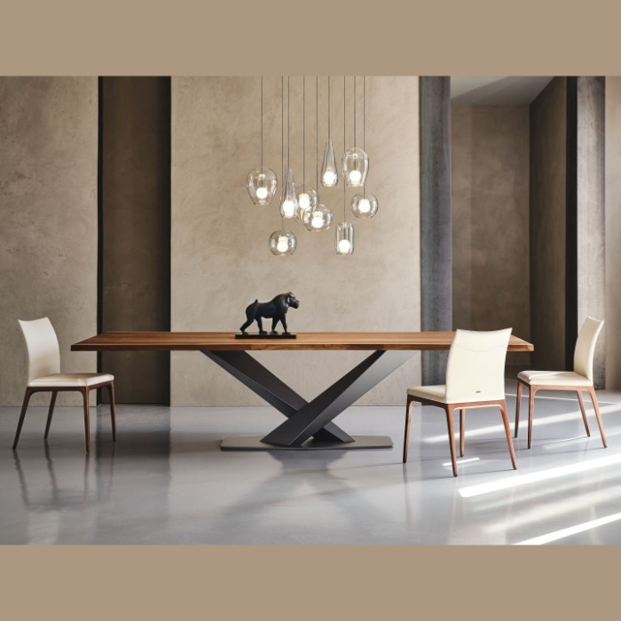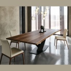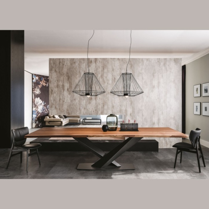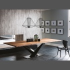Tavolo Stratos Wood di Cattelan Italia realizzato con base in acciaio verniciato goffrato titanio (GFM11), bronzo (GFM18), graphite (GFM69), nero (GFM73). Versione "S" con bordi irregolari in massello di noce Canaletto (NC), rovere bruciato (RB) o rovere naturale (RN) spessore 4cm. Versione "B": piano a botte con bordi bisellati in noce Canaletto (NC) o rovere bruciato (RB). Versione "Masterwood": Piano sagomato in noce Canaletto (NC) o rovere bruciato (RB) realizzato con listelli, diversi tra loro, posizionati in diagonale. Bordi obliqui e arrotondati. Versione "Y": piano con bordi bisellati in legno noce Canaletto (NC) con dettagli in rovere bruciato o rovere bruciato (RB) con dettagli in noce Canaletto.