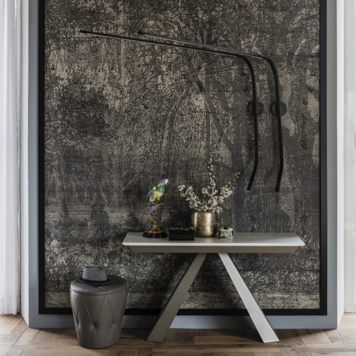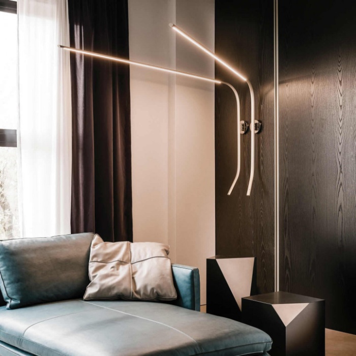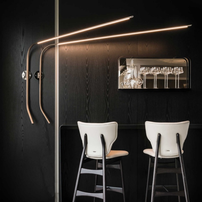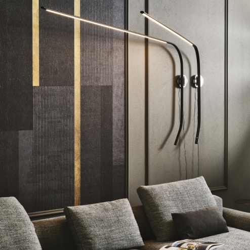 Lampada orientabile da parete con struttura in acciaio verniciato goffrato titanio (GFM11), graphite (GFM69) o nero (GFM73). Illuminazione a led.