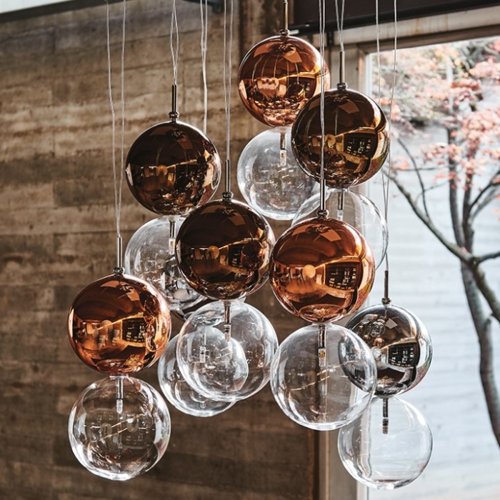 Attacco a soffitto e struttura in acciaio inox. Paralumi in vetro borosilicato nelle finiture come da campionario.