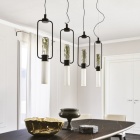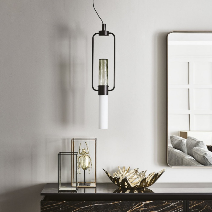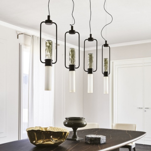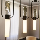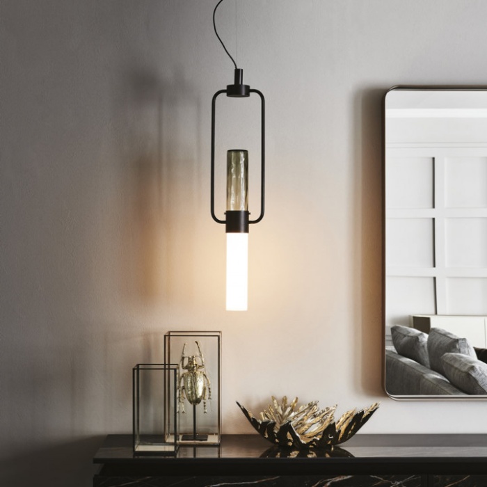 Struttura e attacco a soffitto in acciaio brunito. Paralume in vetro soffiato. Cavo in acciaio inox. Impianto illuminante 110/220V LED 19W. Adatto solo per uso interno.
