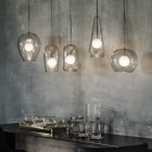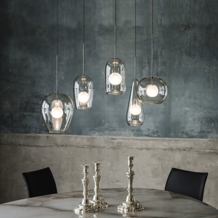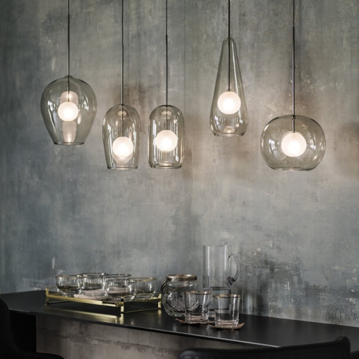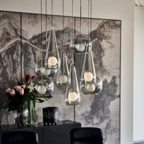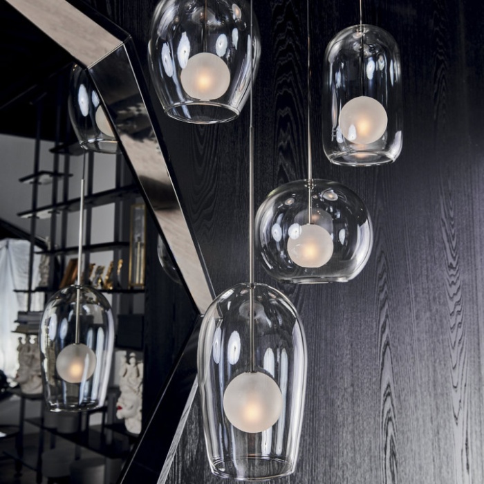 Attacco a soffitto e struttura in acciaio cromato nero. Paralume in vetro borosilicato verniciato fumé.
