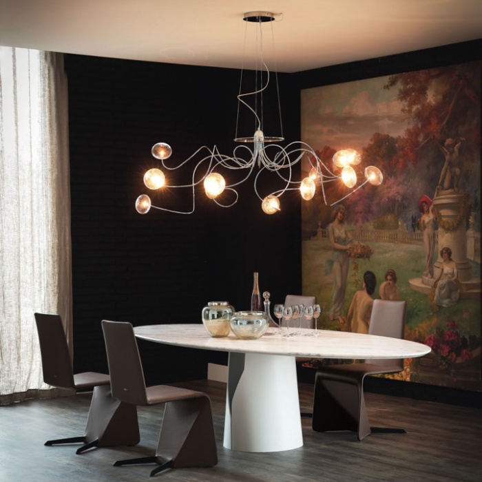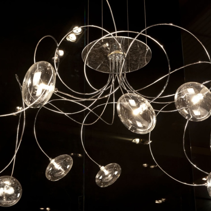 Struttura e attacco a soffitto in acciaio e ottone cromato. Paralumi in vetro borosilicato trasparente.