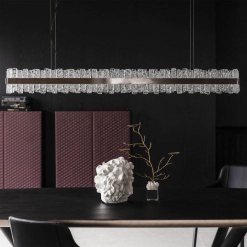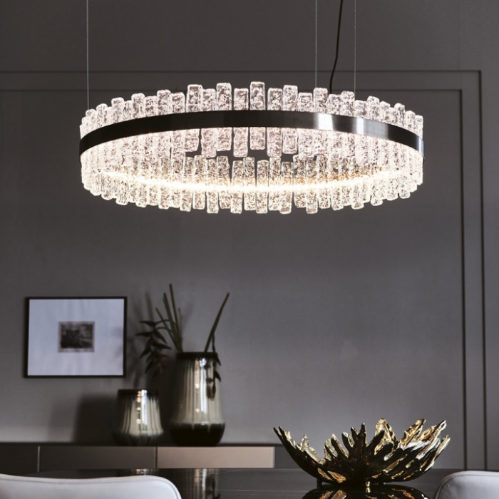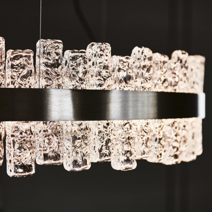 Attacco a soffitto e struttura in acciaio verniciato a polveri epossidiche nichel satinato.Paralume in vetro lavorato a mano.