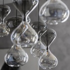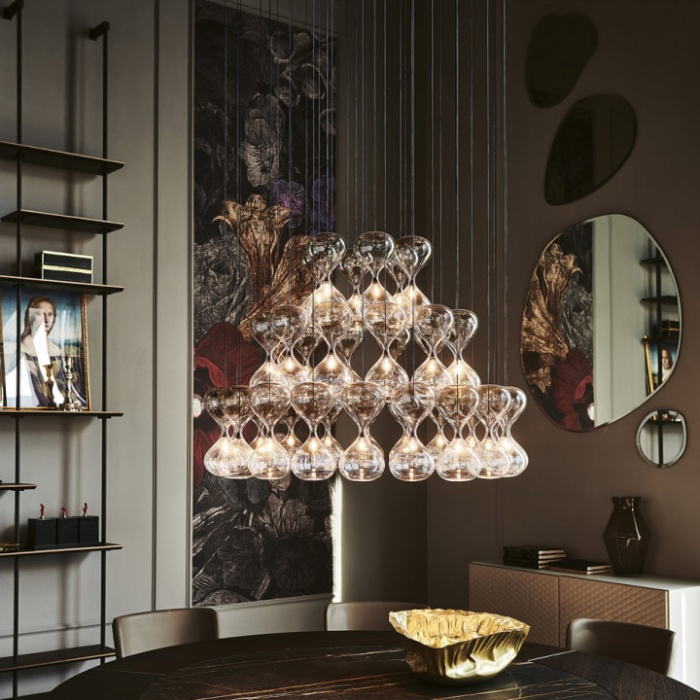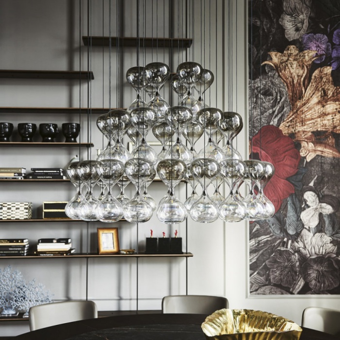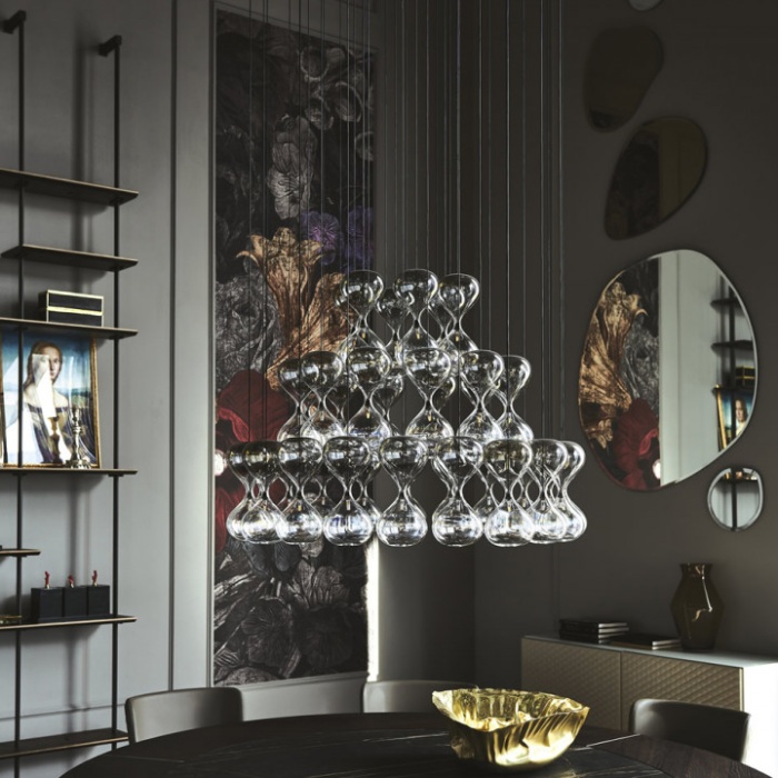 Lampada a soffitto dallo stile moderno e contemporaneo. Forma sinuosa a clessidra che saprà valorizzare la tua zona giorno o notte. Un complemento d'arredo dalla linea attuale che si adatta perfettamente ad un arredamento moderno e raffinato. Paralume in cristallo trasparente o mix (iride-fumé) e attacco a soffitto in acciaio cromo nero (06).