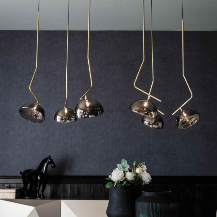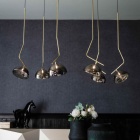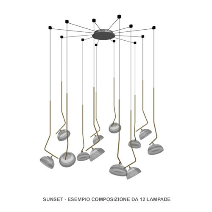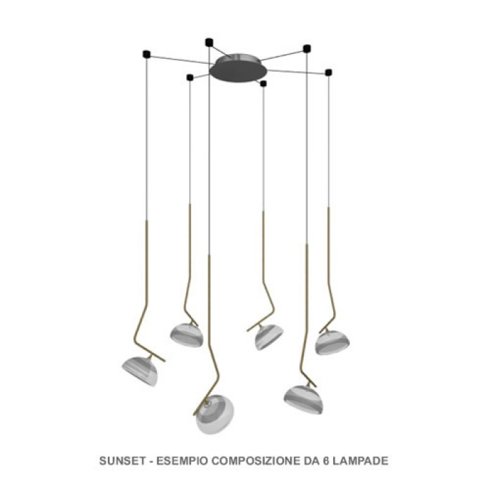 Attacco a soffitto in acciaio cromato nero. Struttura in ottone satinato verniciato a polveri epossidiche trasparente. Paralume in vetro borosilicato verniciato fumé. Decentramento in materiale plastico.Versione 1 lampada: impianto illuminante 220/110V 1 lampadina led 2W attacco G4.