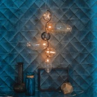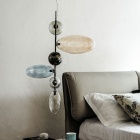 Attacco a soffitto e struttura in acciaio cromato nero. Paralumi in vetro borosilicato trasparente, fumé, azzurro e ambra.