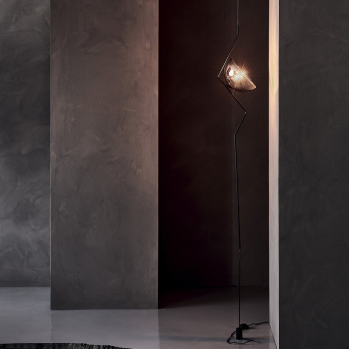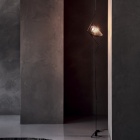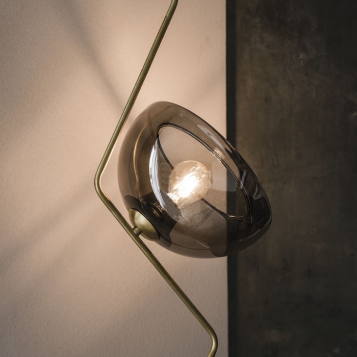 Struttura e attacco a soffitto in ottone satinato verniciato a polveri epossidiche trasparente.Paralume in vetro borosilicato verniciato fumé.