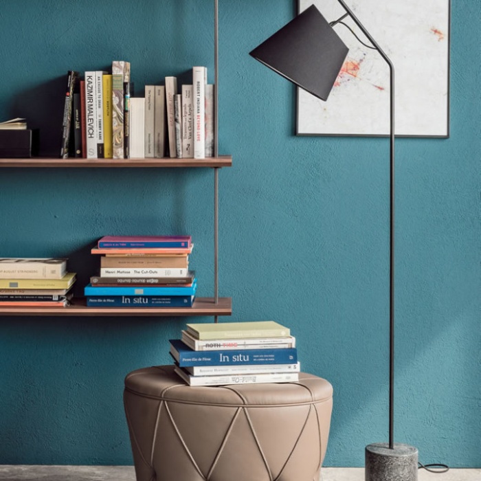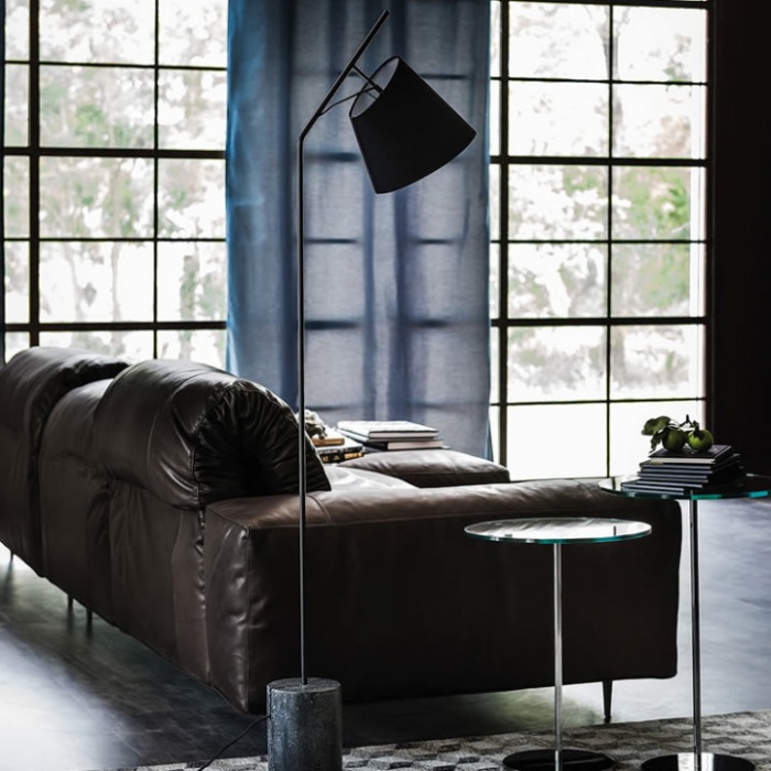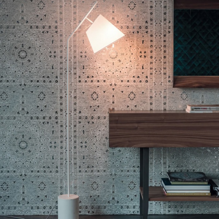 Base in cemento pigmentato nero. Struttura in acciaio verniciato a polveri epossidiche nero opaco. Paralume in tessuto accoppiato con PVC nei colori come da campionario, con diffusore in metacrilato bianco. Impianto illuminante a 220/110V, lampadina 23W attacco E27 con accensione a pulsante.Adatto solo per uso interno.