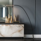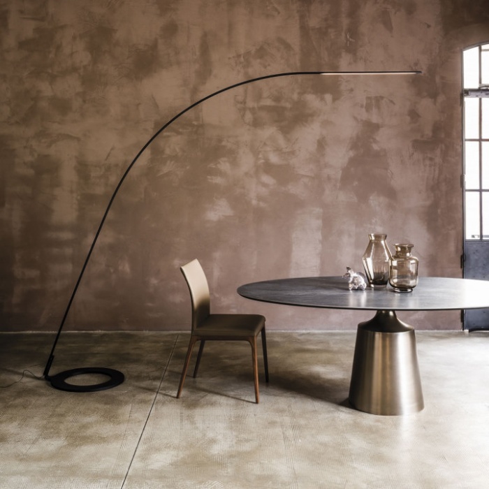 Lampada da terra dal design moderno e minimalista. Struttura in acciaio verniciato goffrato titanio (GFM11), graphite (GFM69) o nero (GFM73). Illuminazione a led, led inclusi.