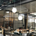Lampada a sospensione in metallo verniciato nei colori RAL. Sfera coprilampada in vetro di Murano di colore bianco.
