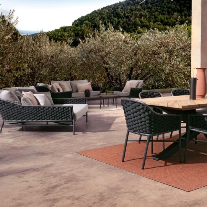 L’elemento distintivo è l’intreccio realizzato in corda di textilene imbottita con gomma nitrilica, che unisce un’estetica moderna a un’estrema comodità.