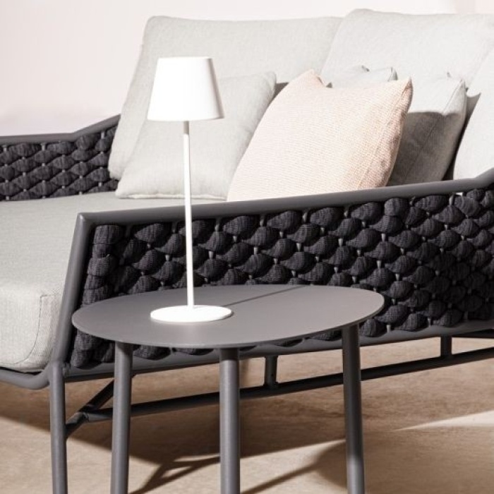 I cuscini seduta e schienale sono sfoderabili, realizzati in tessuto Olefin (100% polipropilene), noto per la sua idrorepellenza, la resistenza ai raggi UV e alle intemperie.