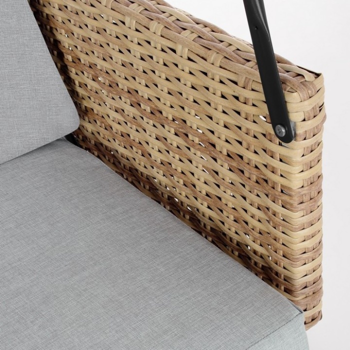 I braccioli sono rivestiti in polyrattan, un materiale resistente ai raggi UV, che dona un tocco naturale al design mantenendo funzionalità e robustezza.