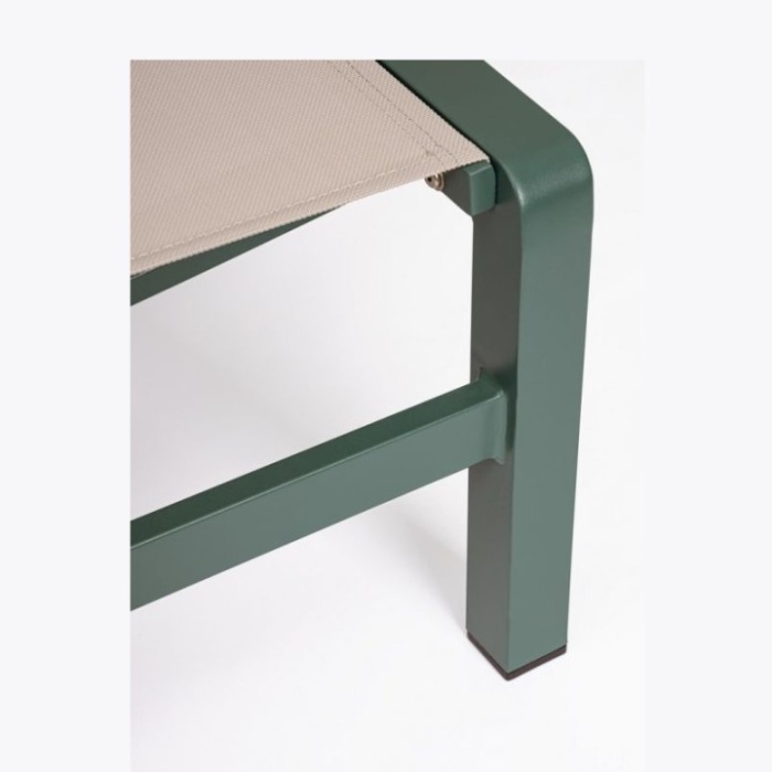 La seduta e lo schienale in textilene 1x1 offrono comfort e traspirabilità anche nelle giornate più calde, senza necessità di cuscini.