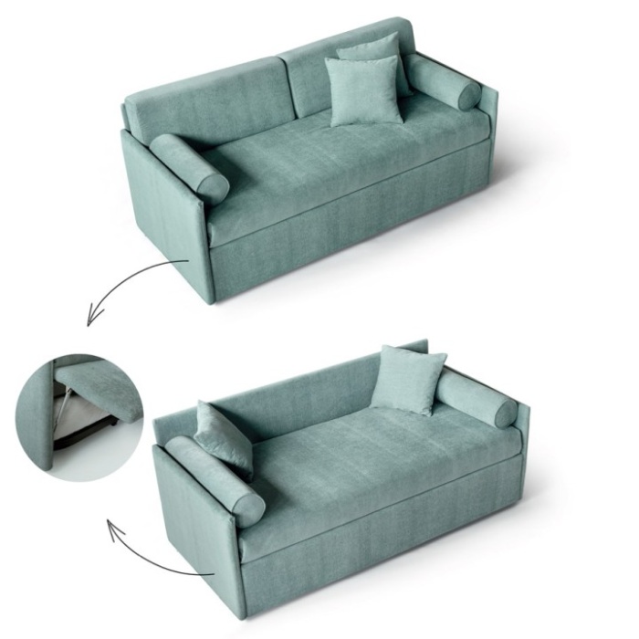 Grazie a questa caratteristica, il Turchese può trasformarsi facilmente in un comodo divano, offrendo una doppia funzione perfetta per ambienti dove ogni centimetro conta. La ribalta è progettata con un braccetto meccanico di sicurezza, che ne facilita l’apertura e la chiusura, garantendo praticità e comfort d’uso quotidiano.