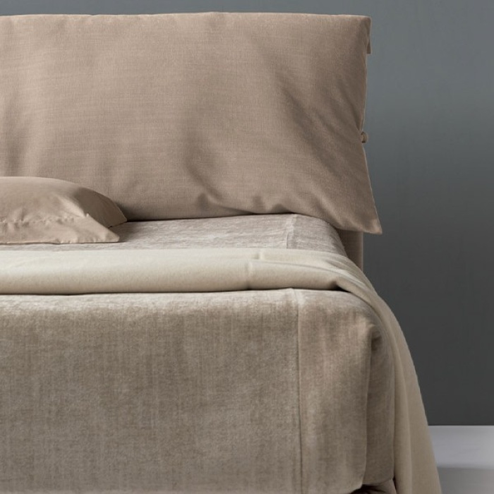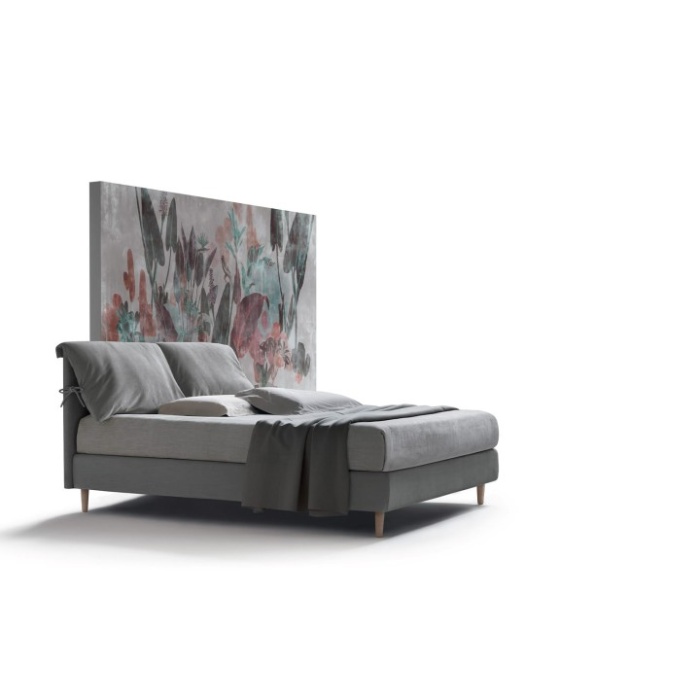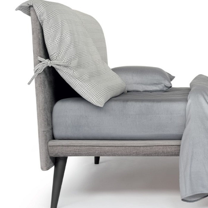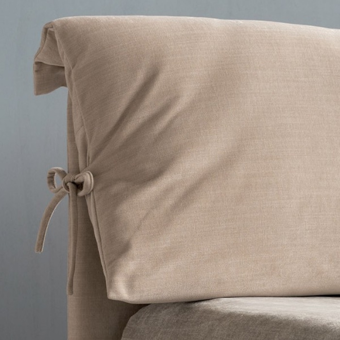 La sua testata imbottita è impreziosita da cuscini legati con fiocchi decorativi, un dettaglio distintivo che dona al letto uno stile unico e riconoscibile.