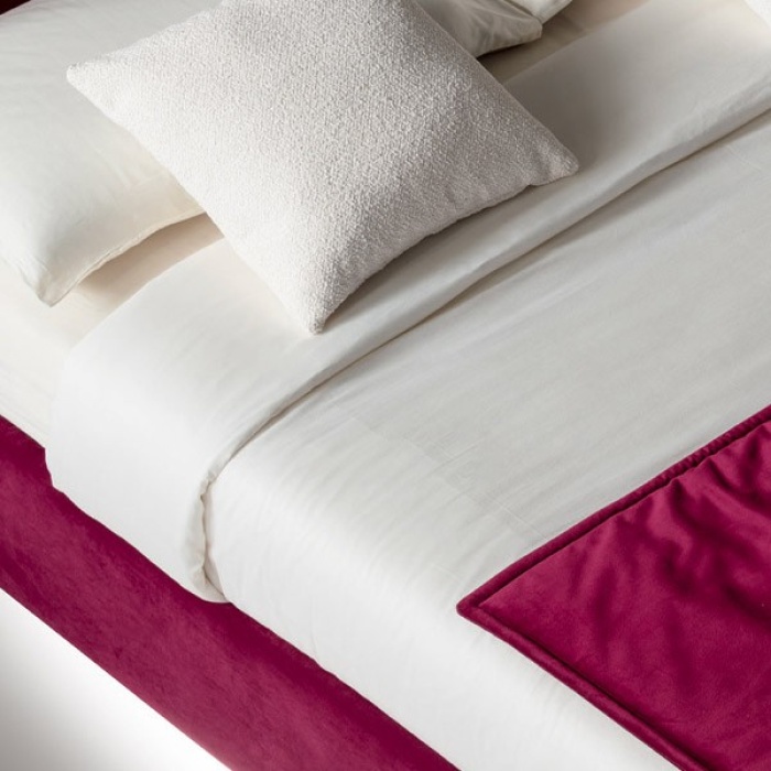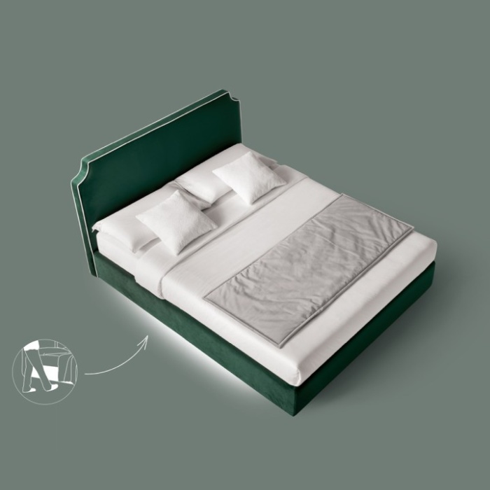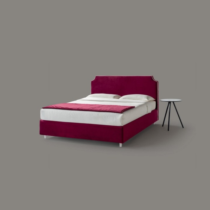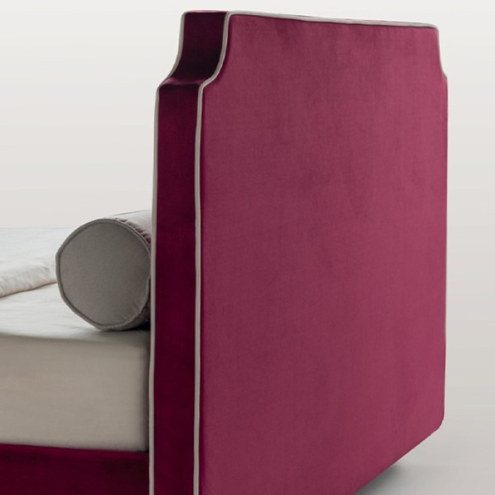 Questa particolare lavorazione conferisce al modello una sensazione di leggerezza e armonia, rendendolo ideale per ambienti sia moderni che classici. Il piping a contrasto, disponibile su richiesta, sottolinea con finezza le linee del letto, creando un piacevole gioco di contorni che ne valorizza la forma.
