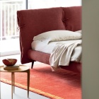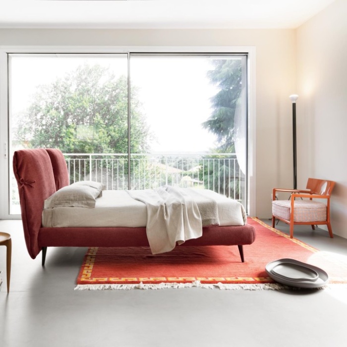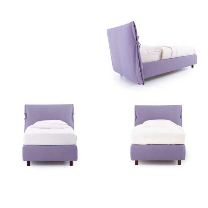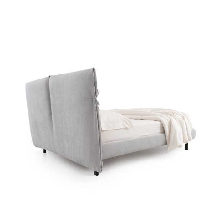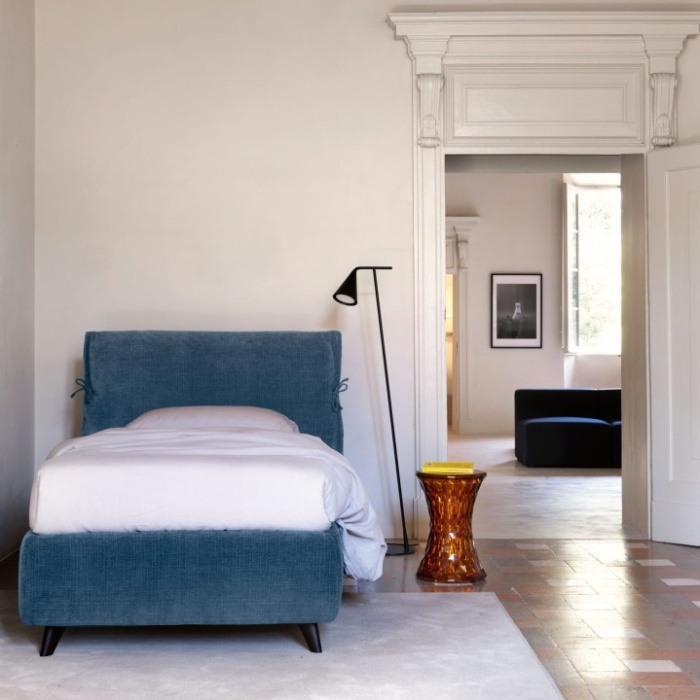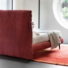 La testiera romantica e avvolgente è impreziosita da fiocchi e alamari sartoriali, che possono essere realizzati tono su tono con il tessuto del letto oppure in contrasto per un effetto più audace. Questo dettaglio sartoriale trasforma il letto in un autentico protagonista della stanza.